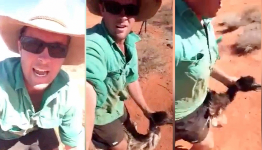 Jack McMillian took a phone video of himself pretending to ride an emu he had just pulled free from a fence as a humorous stunt which has taken a wrong turn.