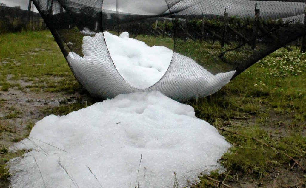 Hail netting at Robert Channon Wines buckled under Mother Nature's wrath, with hail spilling from the catchment pieces.