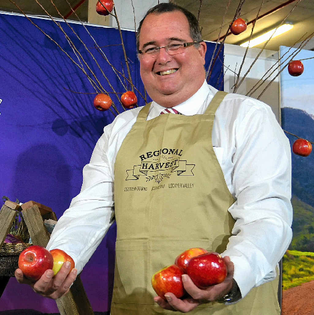 Donning a Regional Harvest apron and holding a handful of red apples, Cr Blundell said the display was a wonderful opportunity for the Southern Downs.