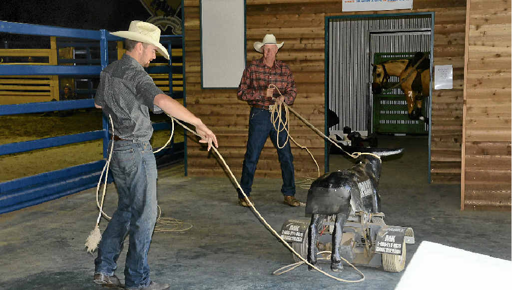 The crowd were in the stand at the northern end of the indoor rodeo arena as American roper Nate Eichhorn and APRA national finalist Allan Flood demonstrated roping.