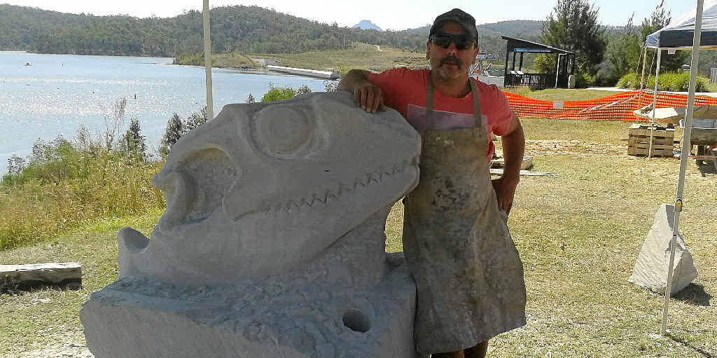 LOCAL sculptor and paleontologist Paul Stumkat has unveiled his water dragon sandstone sculpture at the Lake Wyaralong Sculpture Festival.