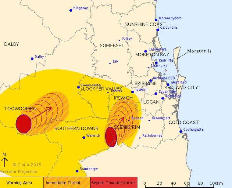 A more general severe thunderstorm warning is also current for parts of the Darling Downs and Granite Belt and Southeast Coast districts.