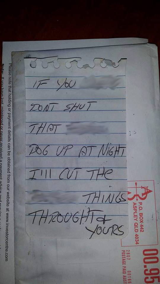The letter warned the Warwick resident that if she didn't "shut that dog up" the person would "cut the f***** things throught (sic) and yours".