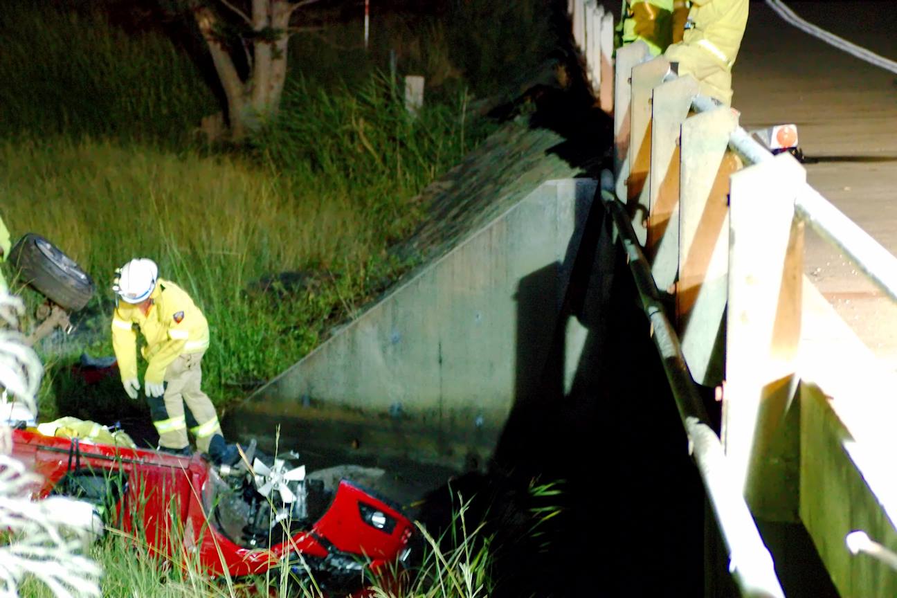 It has been reported the car came off the bridge at the end of Leslie Dam Rd about 6.45pm, landing in the spillway at the dam.