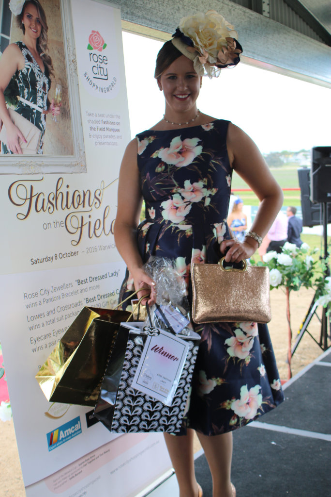 Warwick's Amie Barclay scored an array of prizes as best dressed lady with her floral ensemble, with Amanda Pierce as runner up, while Darwin girl Abbey Seidel won best millinery.